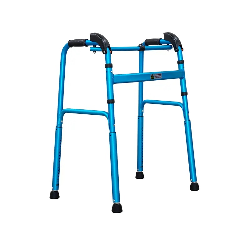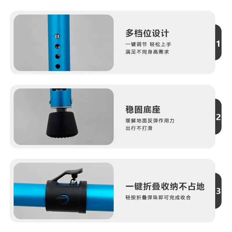 主架、脚管采用高强度铝合金材质,厚度约为1.2mm,表面处理采用阳极氧化处理;可折叠,方便携带,脚管高度16档可调节,脚垫为橡胶材质,360度可旋转,具上下楼梯功能,根据路面平整度和高低随意调节; 把手:采用PVC软质握把,表面有花纹防滑性好,手感舒适,不吸汗,使用时间寿命长。