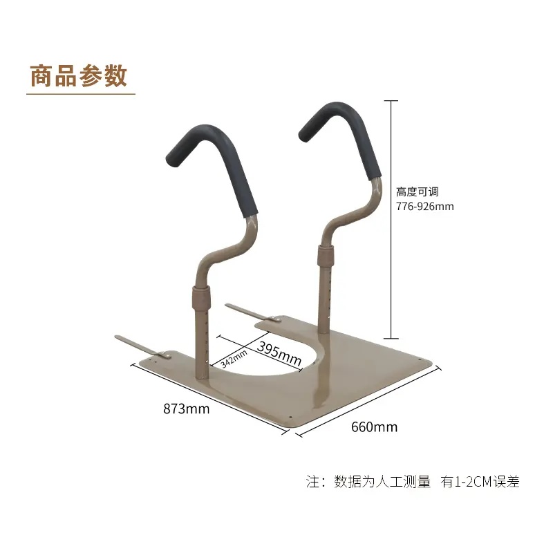 1.全钢质材料,扶手管径35mm强度更好 2.安装在大底板上,稳定性更好; 3.扶手管高度可调,可适合不同身高人士 4.扶手套有EVA泡棉管,抓握更舒适; 5.扶手弯管形状更符合人体工学,起身坐下时抓握更顺手 6.底板有加强板,使用时钢性更好 7.弹珠调节,内外管用塑料锁扣固定,能消除摇晃间隙