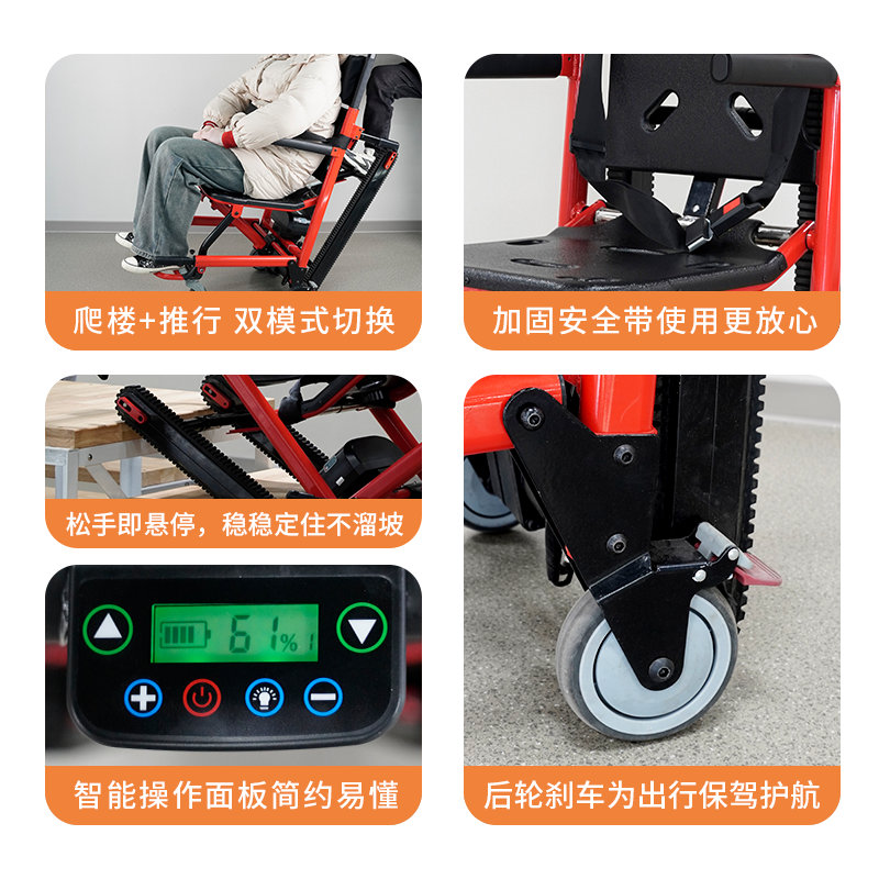 1.座板:高强度ABS板,牢固结实易清洗 4.操作面板:简洁,易操作 5.履带架多角度调节,适应不同角度的楼梯 4.座椅与履带打开无需弯腰即可实现
