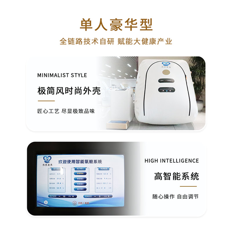 出氧流量:10Lmin(纯氧模式) 出氧压力:100KPa 出氧浓度:90% 功率:850W 选配:水冷空调 微高压环境刺激小,微高压氧舱内压力略高于大气压,一般在1.1-.1.5个大气压之间,这种温和压力对刺激小。使用过程中无需专职医生时刻在场,方便用户自主安排氧疗,节省人力成本。