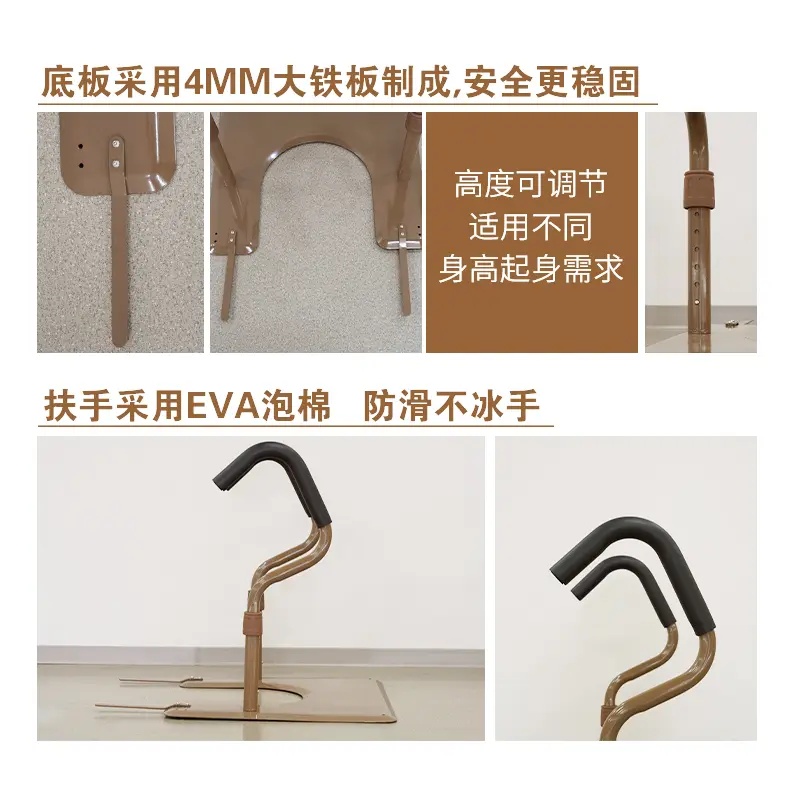1.全钢质材料,扶手管径35mm强度更好 2.安装在大底板上,稳定性更好; 3.扶手管高度可调,可适合不同身高人士 4.扶手套有EVA泡棉管,抓握更舒适; 5.扶手弯管形状更符合人体工学,起身坐下时抓握更顺手 6.底板有加强板,使用时钢性更好 7.弹珠调节,内外管用塑料锁扣固定,能消除摇晃间隙