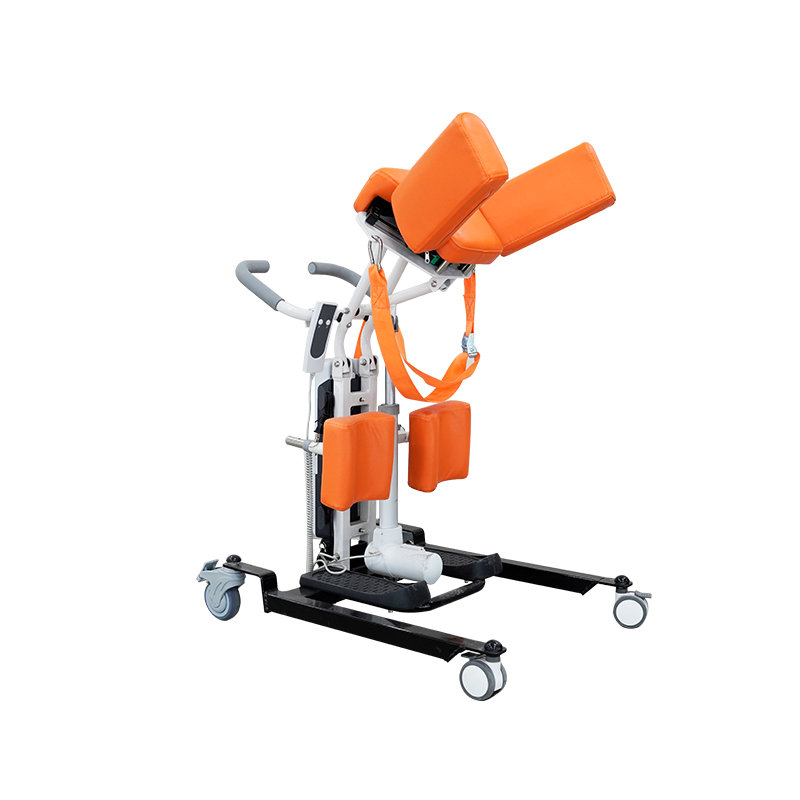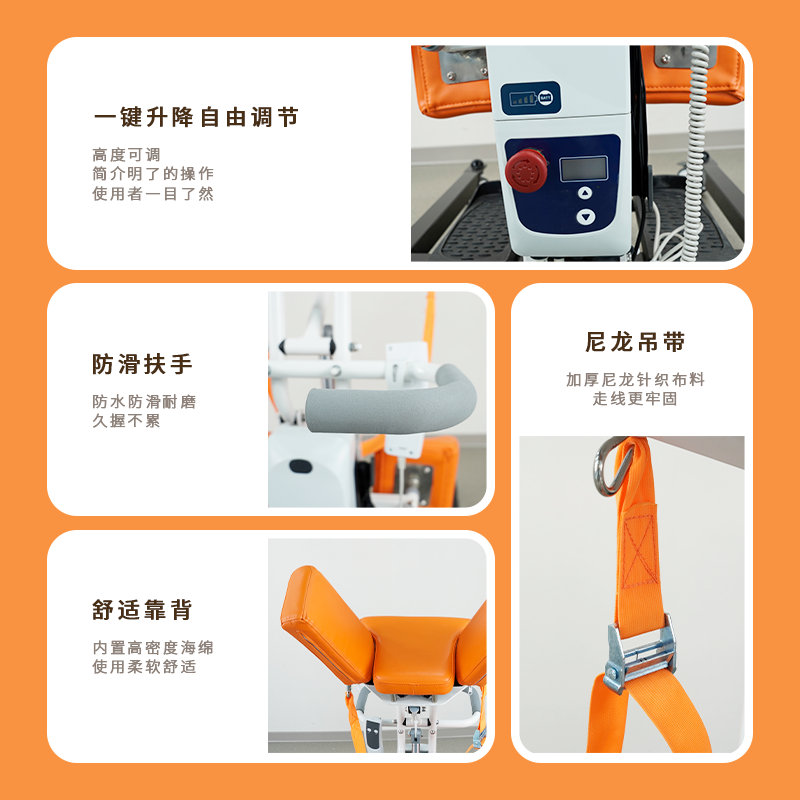 适用于轮椅、马桶、护理床、沙发、座椅、洗澡椅…半失能人群移位作用;方便行动困难人群(上半身机能较好),从轮椅到沙发、床、坐便器、座椅等之间相互移位;大容量电池超长续航,5.0Ah电池容量,可以拆装充电,适合连续工作;极大减轻护理人员的工作强度,实现安全轻松护理。 使用方法 1.让使用者直立坐起,将移位机缓缓靠近,把使用者的脚放到脚踏板上,把两侧腋托软垫放在腋下位置,操作手控器上升按钮,把使用者从座位上缓缓升起。 2.把移位机移动至目标位置,移动过程中操作者注意保护使用者身体稳固。调整好移位机位置后,锁定刹车,按下手控器下降按钮,把使用者身体下降至新座位上。